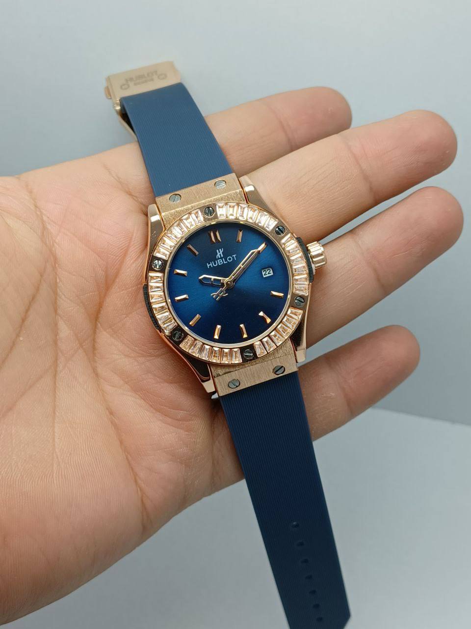 ساعت مچی زنانه هابلوت قاب نگین تقویم بند رابر معطر Hublot